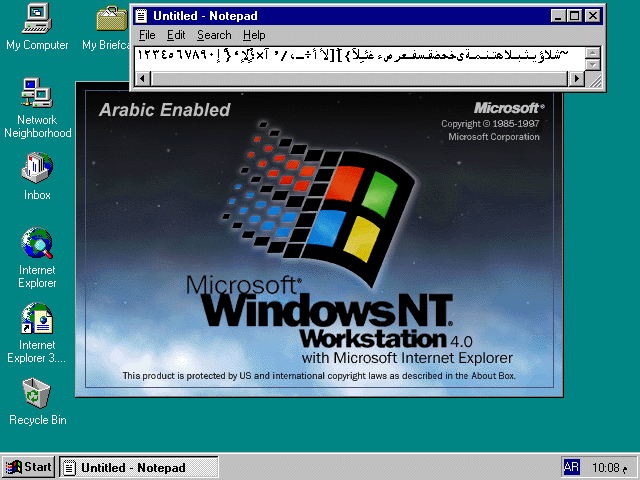 インストールは全て英語で行われた。日本語版と同じようにアラビア語を打つときはモードを切り替える。画像の文字列は「1234567890..z−a」である。アラビア語は右から文字を書くのでカーソルの動きが独特だった。スタートメニュー、コントロールパネルは英語。