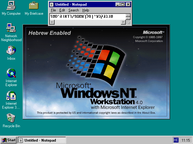 インストールは全て英語で行われた。日本語版と同じようにヘブライ語を打つときはモードを切り替える。画像の文字列は「z−a」である。アラビア語は右から文字を書くのでカーソルの動きが独特だった。スタートメニュー、コントロールパネルは英語。