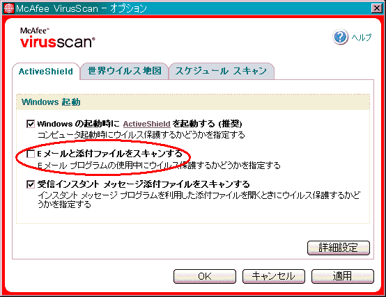 当該ウイルス対策ソフトには「Eメールと添付ファイルをスキャンする」機能があるようですが、その起動中に「Virus Mail Killer」を実行すると、「Virus Mail Killer」側のログファイルを消してしまうという事故がありました。