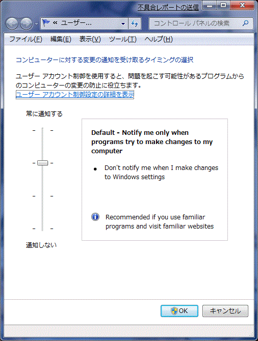 多少英語が残っているのはβ版のご愛嬌ですが、デフォールトの状態では普通に操作していてもUACで聞いてくる回数が格段に減りました。恐らく最高の段階で「常に通知する」だと Vista のようにうざくなるのだと思われます。